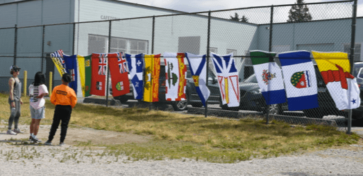 June 27 marked the day of the inaugural Great Canuck at John Oliver Secondary School. ELL students had a great sunny day, running the field and experiencing some of the great Canadian activities: tight rope walking with images of the Niagara Falls, salmon spear fishing the Salish way, carrying logs like a lumber jack, climbing up and sliding down the Rocky Mountains and into an icy lake, swinging and climbing as a salmon would battle up stream. They had a quick lesson about the Provincial flags.
